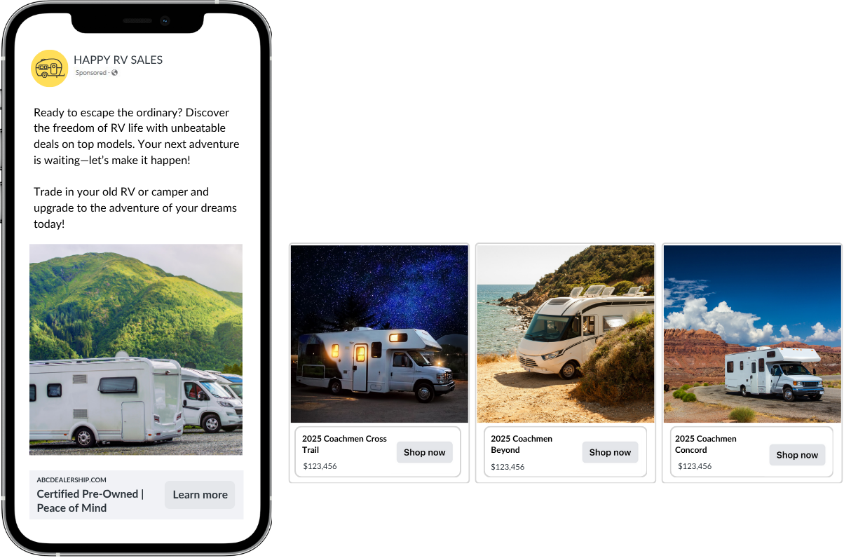 Showcase big-ticket RVs and campers with campaigns that sell the dream of adventure while saving your team hours.
