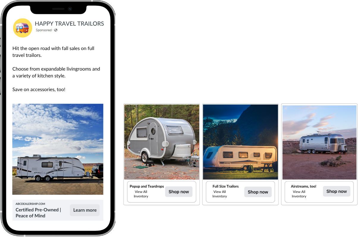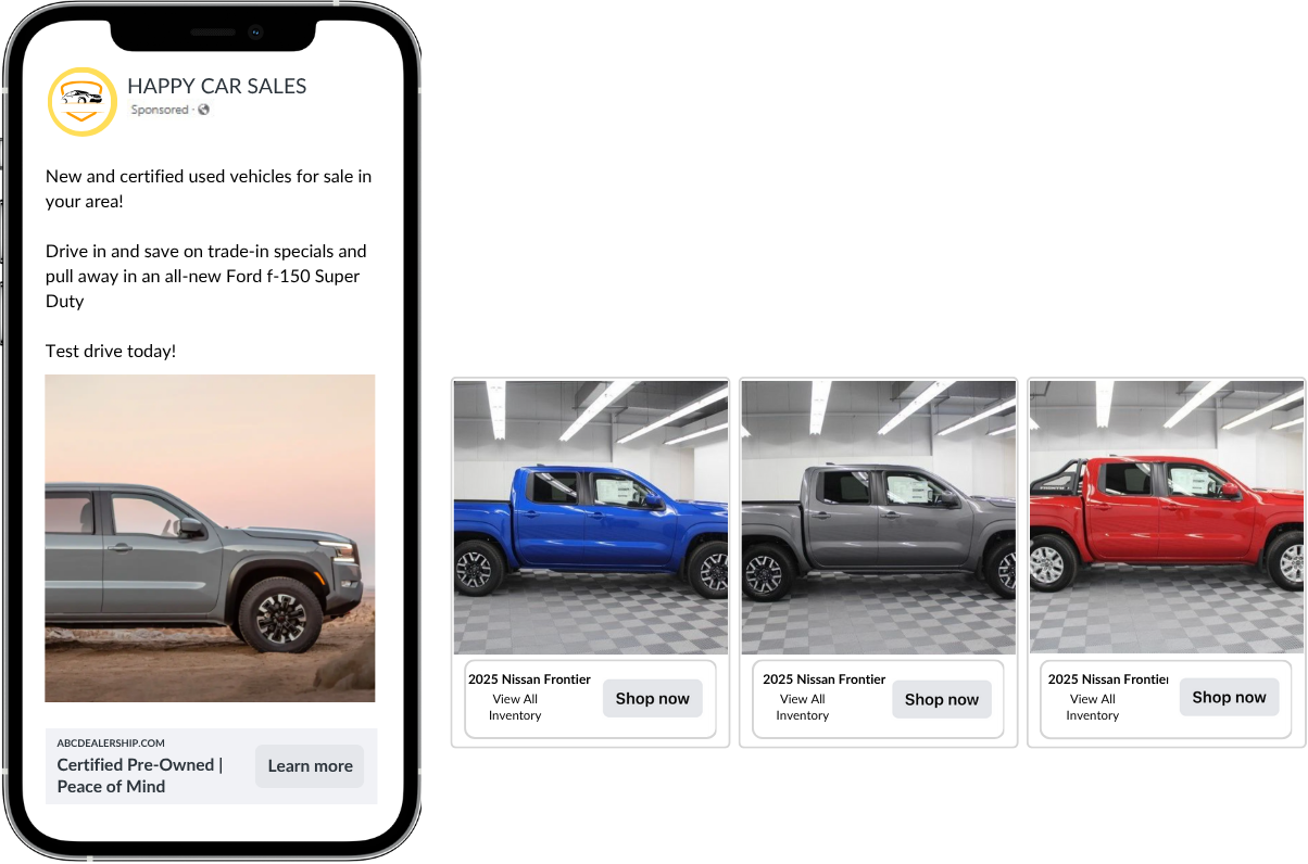 Dynamic ads refresh daily, so shoppers always see what’s on the lot right now. Put every car, truck, and SUV in the spotlight.
